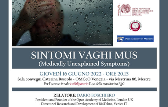 Ne parleremo nella dala convegni Caterina Boscolo dell'Ordine (in via Mestrina 86 a Mestre) la sera del 16 giugno, inizio ore 20.15, Dario Boschiero, direttore Ricerca e Sviluppo BioTekna, fondatore e coordinatore del progetto “M.U.S., sintomi vaghi e aspecifici, infiammazione cronica e nutrizione clinica” e presidente dell’Open Academy of Medicine. Un gradito ritorno nelle serate di aggiornamento organizzate dalla Fondazione Ars Medica.