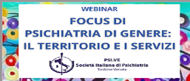 La sezione Veneta della Società Italiana di Psichiatria, con il patrocinio dell'Omceo Venezia, organizza il webinar dal titolo " pdf Focus di psichiatria di genere: il territorio e i servizi (698 KB) " che si svolgerà il giorno 11 luglio 2022 dalle ore 15.30 alle ore 19.00.