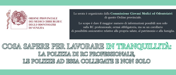 La Commissione Giovani Medici e Odontoiatri dell'OMCeO Venezia, sotto la guida scientifica di Andrea Zornetta, ha organizzato una serata di aggiornamento sul tema Cosa sapere per lavorare in tranquillità: la polizza di RC Professionale, le polizze ad essa collegate e non solo. L'iniziativa è in programma per giovedì 15 dicembre 2022, a partire dalle ore 20.30, al Centro Pastorale Cardinal Urbani di Zelarino. A chiarire ogni dubbio e a rispondere alle domande dei partecipanti saranno il dottor Ferdinando Barracano, consulente assicurativo dell'OMCeO Venezia, e il suo staff.