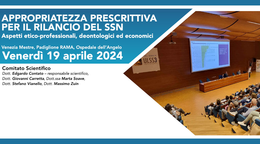 Il convegno Appropriatezza prescrittiva per il rilancio del SSN. Aspetti etico-professionali, deontologici ed economici, organizzato dall'Ulss 3 Serenissima è in programma venerdì 19 aprile 2024 a partire dalle ore 8.50 al Padiglione Rama dell'Ospedale dell'Angelo (Mestre Venezia).