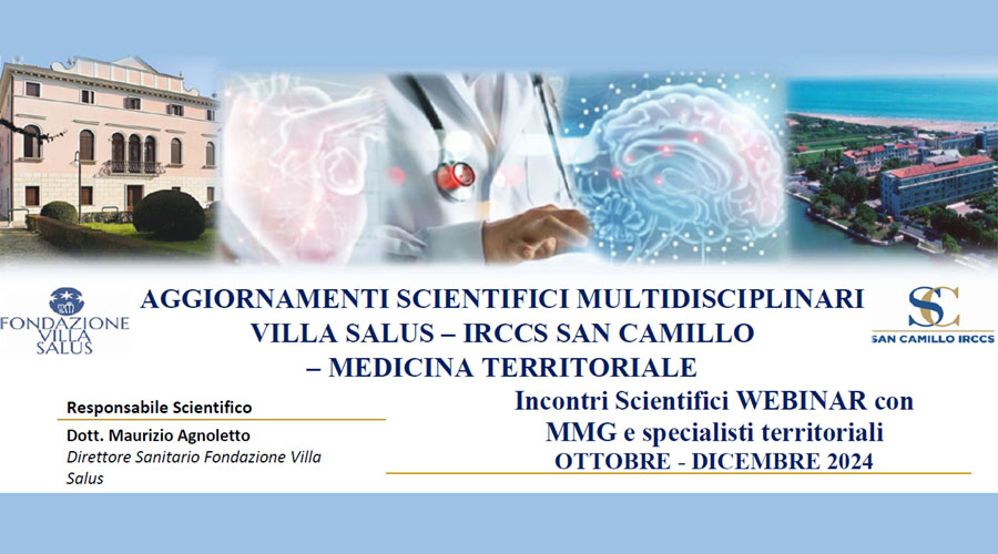 Partirà il prossimo 22 ottobre il nuovo corso sugli aggiornamenti scientifici multidisciplinari proposto da Fondazione Villa Salus e San Camillo IRCCS, che mette a confronto medici di famiglia e specialisti ambulatoriali. Con la guida scientifica del dottor Maurizio Agnoletto, direttore sanitario della Fondazione, saranno 6 i webinar proposti su temi diversi della durata di un'ora e mezza ciascuno: la chirurgia vascolare, l'orticaria, i disturbi dell'orecchio, le dipendenze, la gammopatia monoclonale e gli iperandrogenismi.