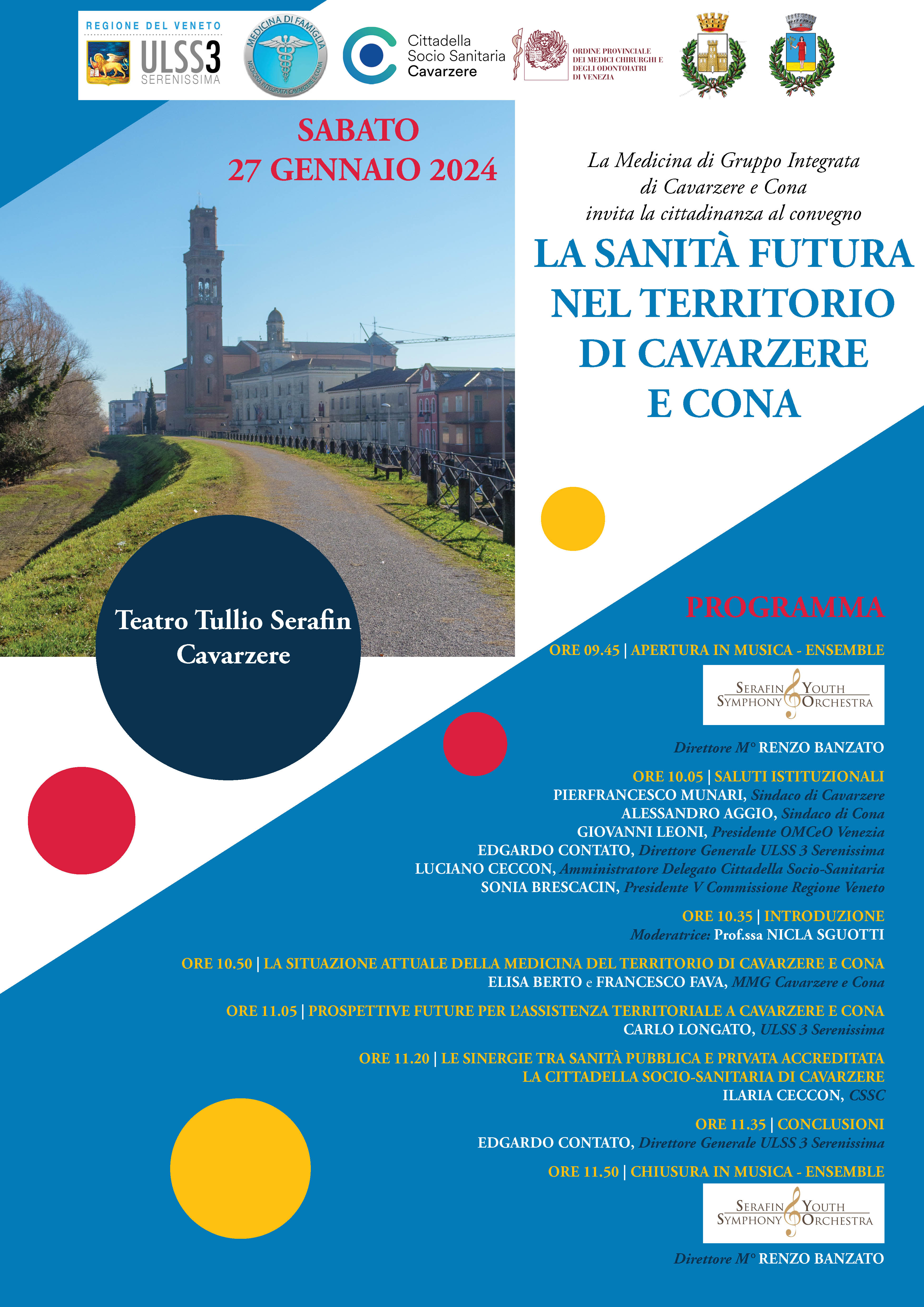 La Medicina di gruppo Integrata di Cavarzere e Cona "Medicina Futura", con il patrocinio dell'OMCeO Venezia, organizza la “ image Festa del Medico di Cavarzere (1.46 MB) ” che si svolgerà presso il Teatro Comunale il 27 gennaio 2024.