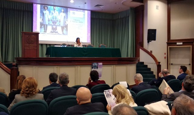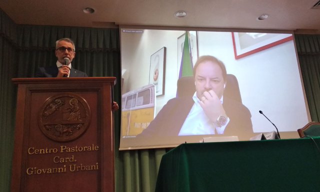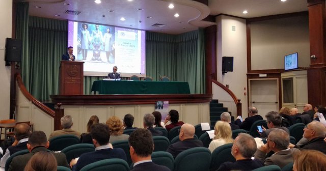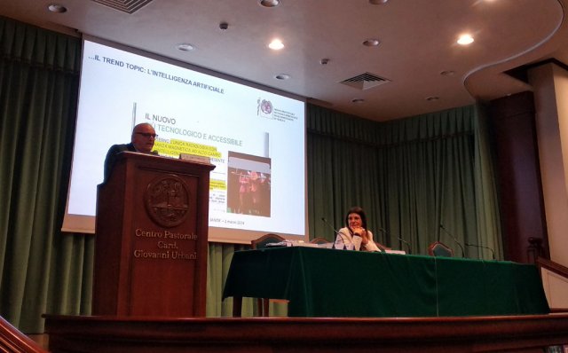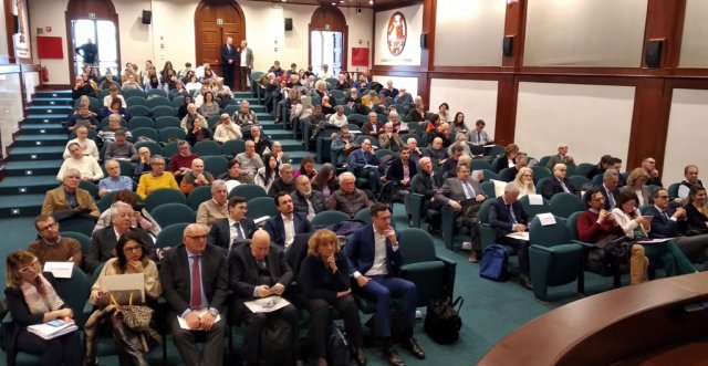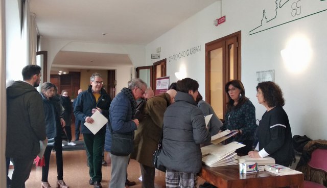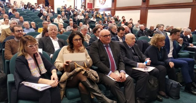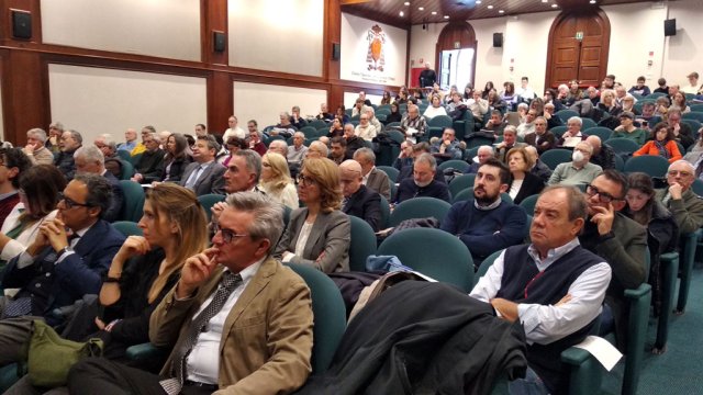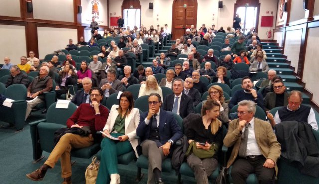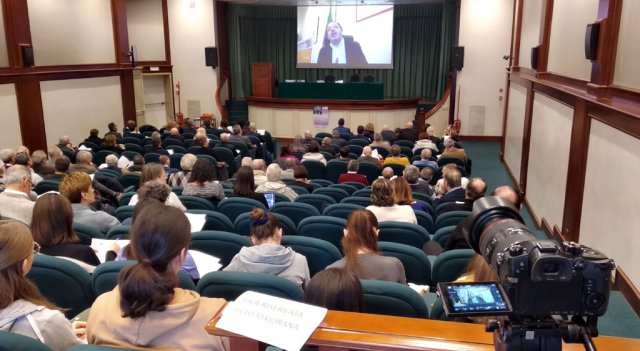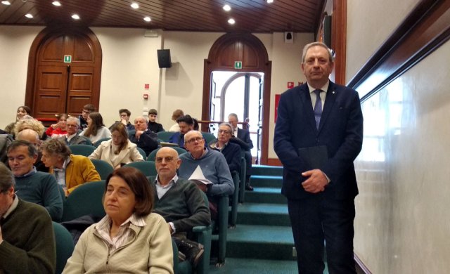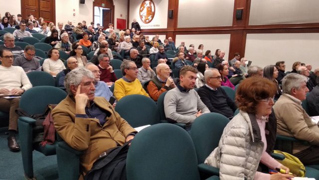 Da sinistra con il microfono Giovanni Leoni, seduto Giuliano Nicolin, sul maxischermo Guido Scorza