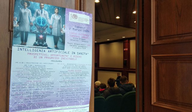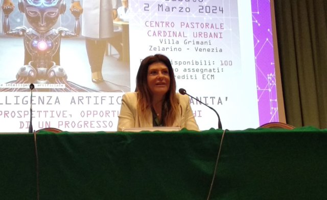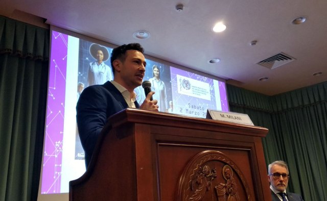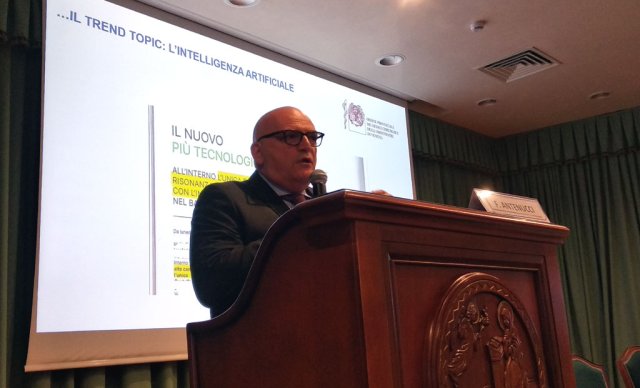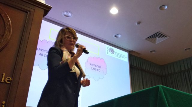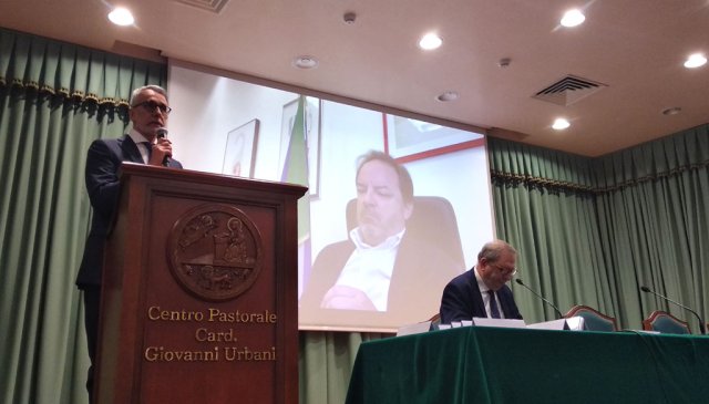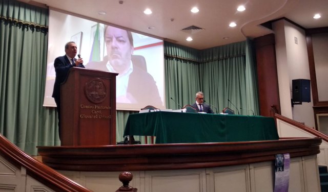 Con il microfono Giuliano Nicolin, sul maxischermo Guido Scorza
