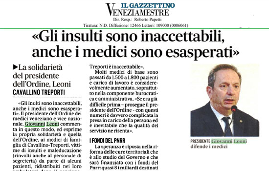 Solidarietà dell'Ordine ai medici di famiglia di Cavallino-Treporti, vittime di insulti e offese da parte di alcuni assistiti: i quotidiani locali rilanciano le parole espresse ieri, giovedì 12 maggio 2022, dal presidente dell'OMCeO veneziano e vice nazionale Giovanni Leoni - «I pazienti sono esasperati, ma anche i medici» - che punta l'attenzione sulla carenza di camici bianchi, e non solo sul territorio, denunciata ripetutamente.