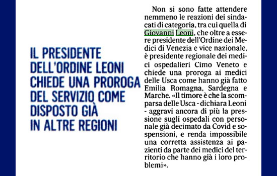 «La Regione proroghi le USCA, come hanno già fatto Sardegna, Emilia Romagna e Marche»: è chiara la richiesta che arriva dal presidente dell'OMCeO veneziano e vice nazionale Giovanni Leoni, nella sua veste anche di segretario di CIMO Veneto, preoccupato per l'aumento dei contagi e il contemporaneo stop alle attività delle USCA, con ricadute pesanti che potrebbero arrivare sia sulla pressione per gli ospedali e sia sulle attività dei medici di famiglia. L'intervista, rilasciata a Filomena Spolaor, è stata pubblicata ieri, domenica 10 luglio, sul Gazzettino di Venezia.